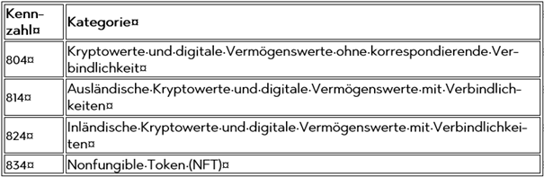 Für Kryptowerte wurden zudem neue Kennzahlen eingeführt, die eine präzisere Zuordnung ermöglichen: